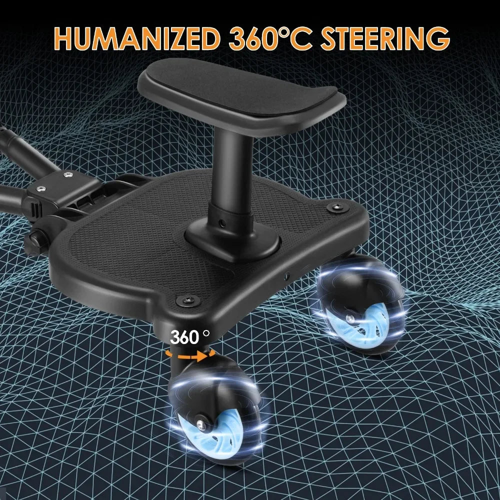Plataforma segundo niño con asiento desmontable y correa de recogida. Compatible con la mayoría de cochecitos; ideal 3–7 años.