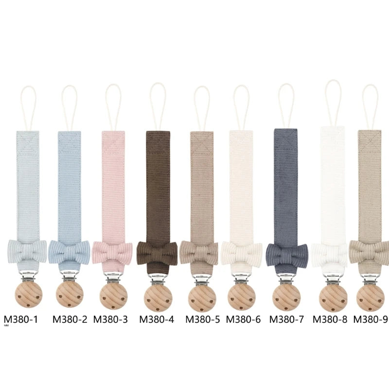 Clip de madera con cinta de algodón (diseños y colores llamativos) para mantener el chupete limpio y a mano. 0–36 meses.