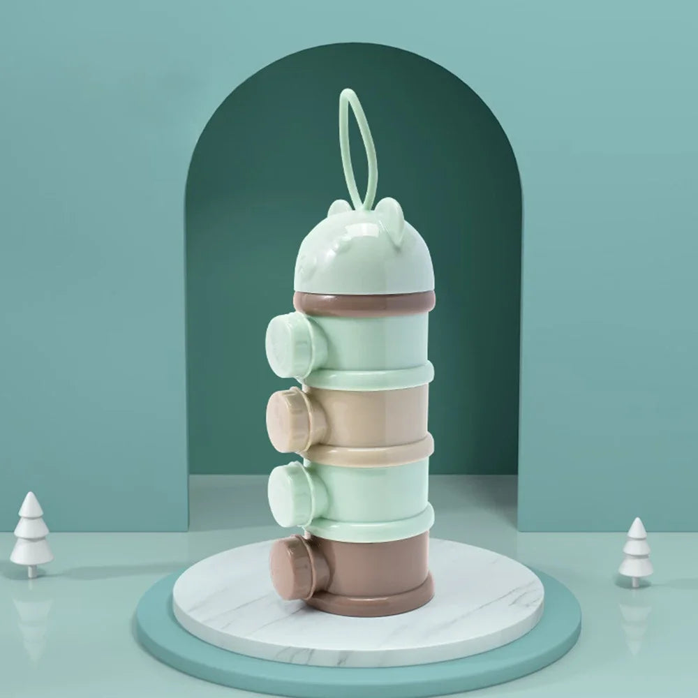 Caja organizadora de leche en polvo portátil de 4 capas con diseño de oso. Ideal para preparar tomas fuera de casa o guardar snacks. Compacta, apilable y fácil de llevar en el bolso de maternidad.