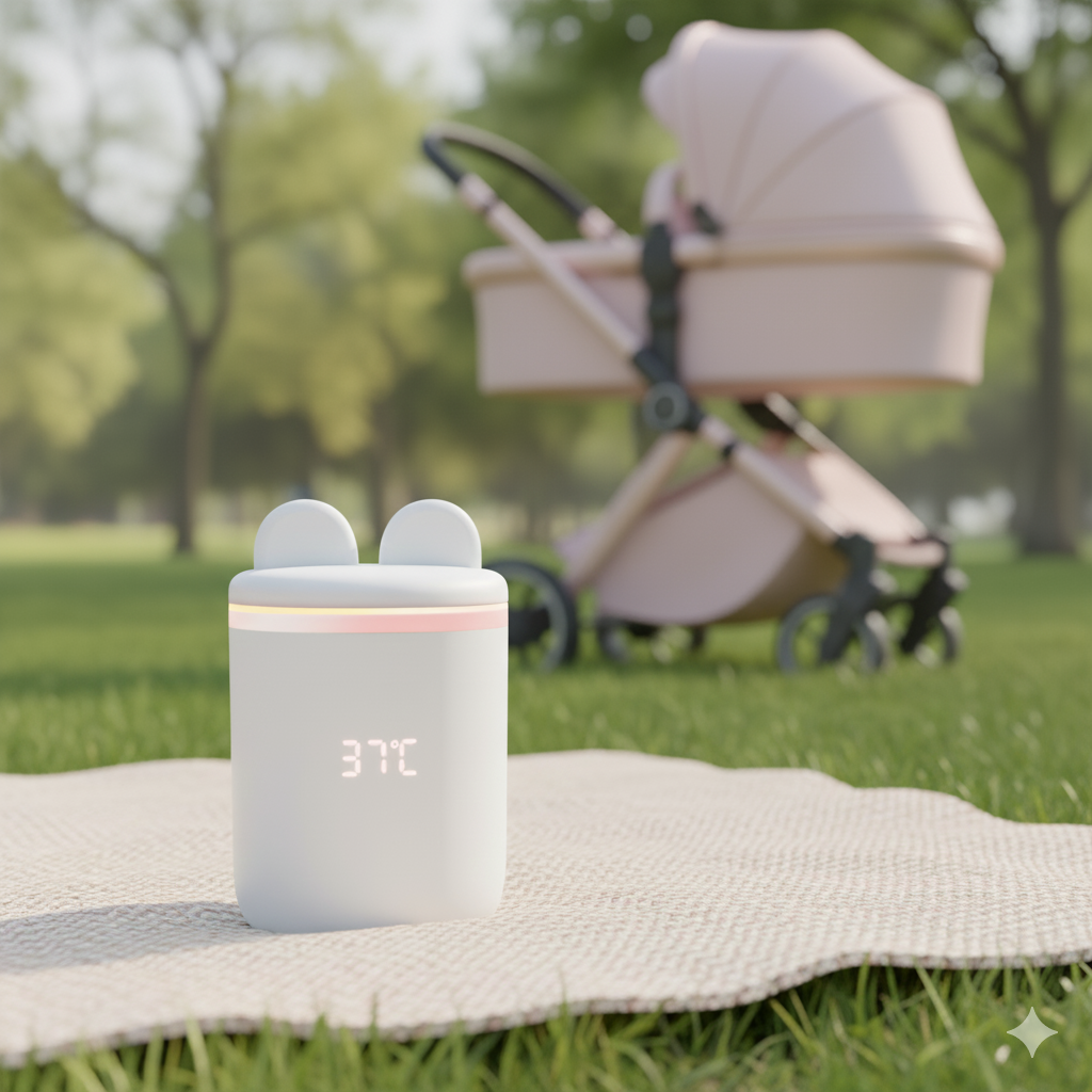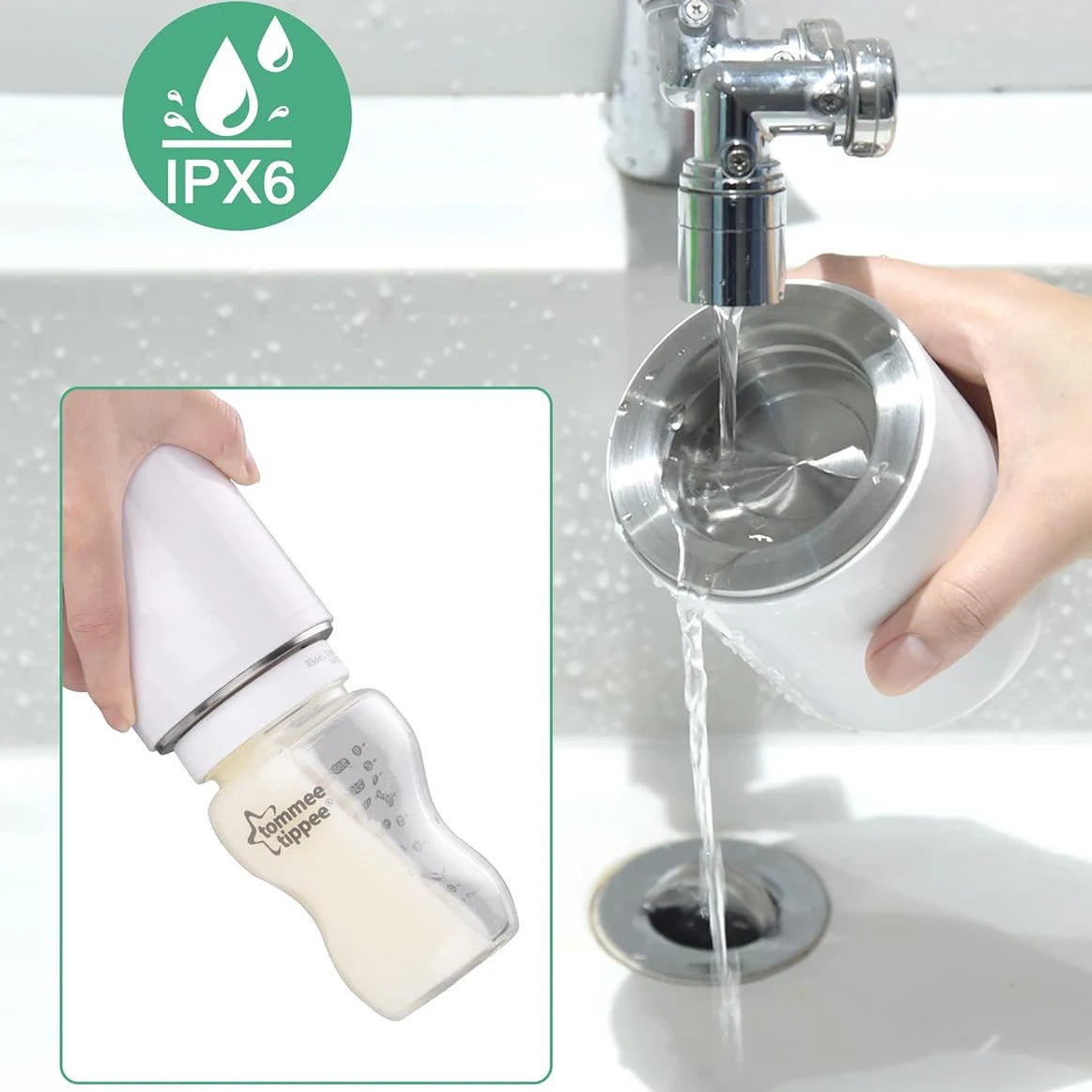 Calentador portátil recargable (8800 mAh) con 4 temperaturas (37/40/45/50 °C), 55 W y LCD; ~2,5 min para 120 ml a 37 °C*. IPX6 y adaptadores 39/50/56 mm. USB-C.