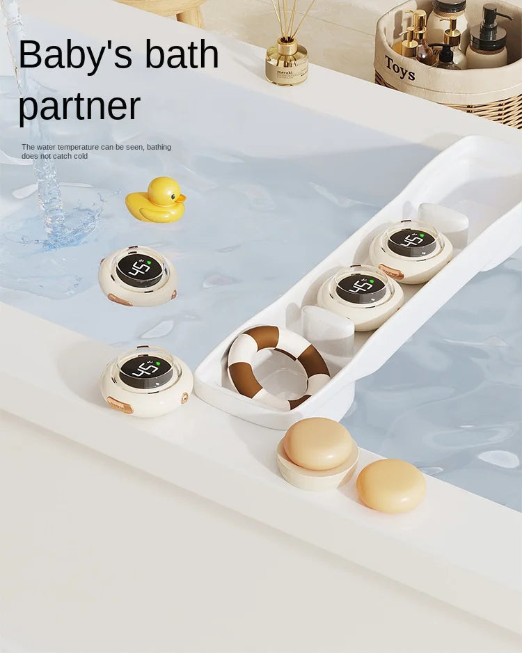 Termómetro infantil con diseño de nave espacial para bebés y niños. Mide la temperatura del agua en bañera o ducha de forma rápida y clara, ideal para uso doméstico diario.